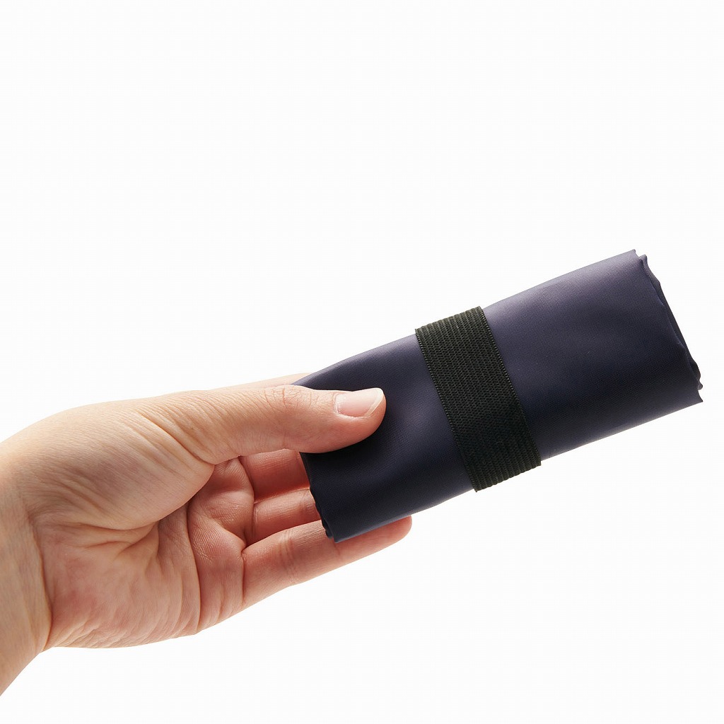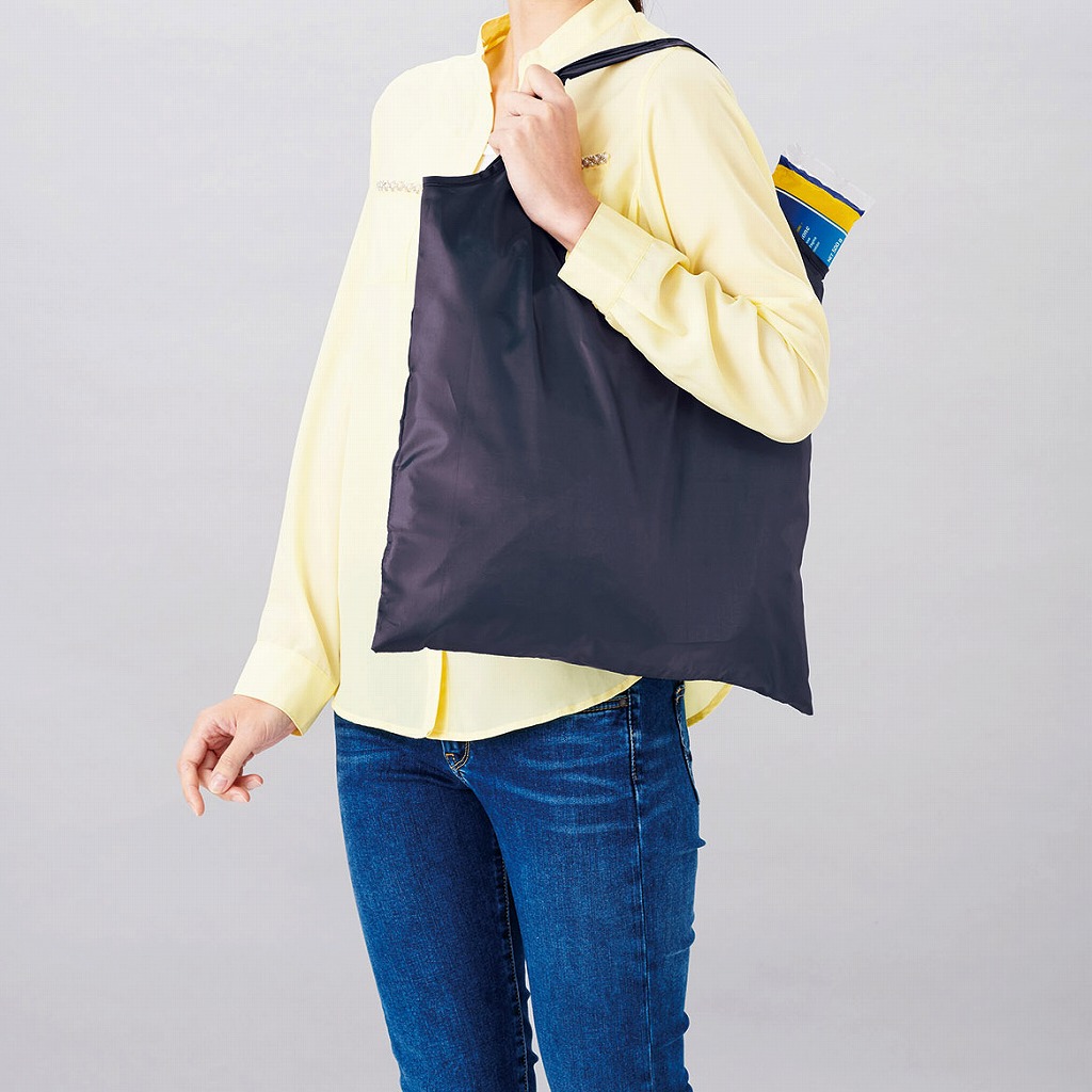 シンプルデザインのお買い物用エコバッグ。 使わない時は、ベルトで留めるだけだから簡単に収納でき、使う時に広げると大きなショッピングバッグに変身します。 スーパーのレジ袋削減に役立つ環境に優しいエコグッズです。