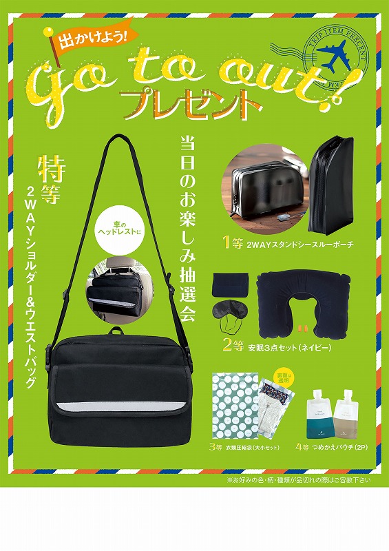 特等:2WAYショルダー&ウエストバッグ×1コ/1等:2WAYスタンドシースルーポーチ×2コ/2等:安眠3点セット(ネイビー)×3コ/3等:衣類圧縮袋(大小セット)×4コ/4等:つめかえパウチ(2P)×40コ/A3ポスター/抽選箱/くじ50枚/店頭用お知らせPOP2枚