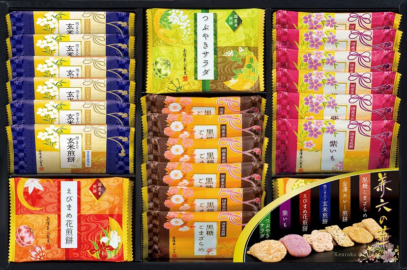 黒糖ごまざらめ煎餅×6枚、黒ごま入り玄米煎餅×6枚、紫いも煎餅×6枚、金澤カレー煎餅×4枚、えびまめ花煎餅×4枚、つぶやきサラダ煎餅×4枚
