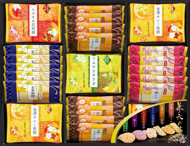 金澤カレー煎餅×10枚、えびまめ花煎餅×10枚、黒糖ごまざらめ煎餅×8枚、黒ごま入り玄米煎餅×5枚、紫いも煎餅×5枚、つぶやきサラダ煎餅×5枚