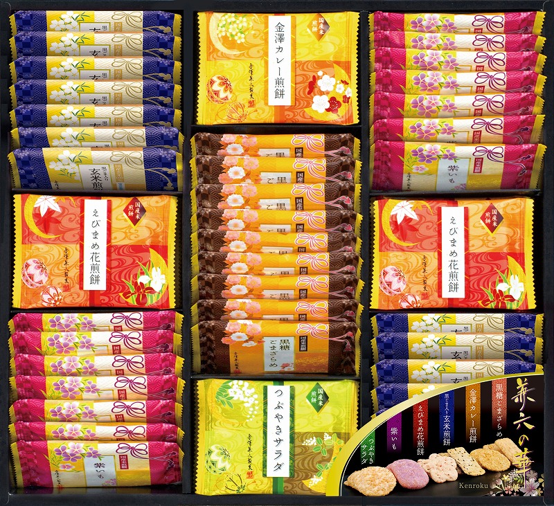 黒ごま入り玄米煎餅×14枚、紫いも煎餅×14枚、えびまめ花煎餅×12枚、黒糖ごまざらめ煎餅×9枚、金澤カレー煎餅×6枚、つぶやきサラダ煎餅×6枚