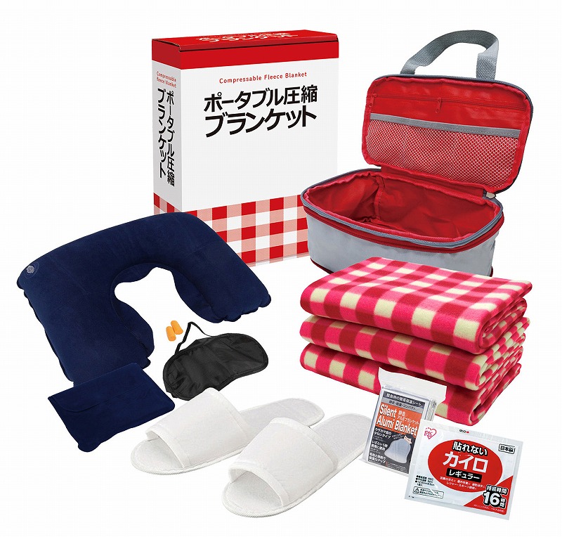 圧縮収納バッグ、フリースブランケット×3、ネックピロー、アイマスク、耳栓、静音アルミブランケット、スリッパ、カイロ