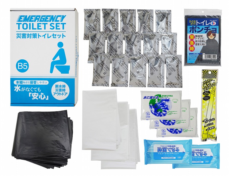 吸収性凝固剤×15、排便処理袋×15、収納外袋×3、水に流せるペーパー×3、除菌アルコールウェットティッシュ×2、トイレポンチョ、発光スティック