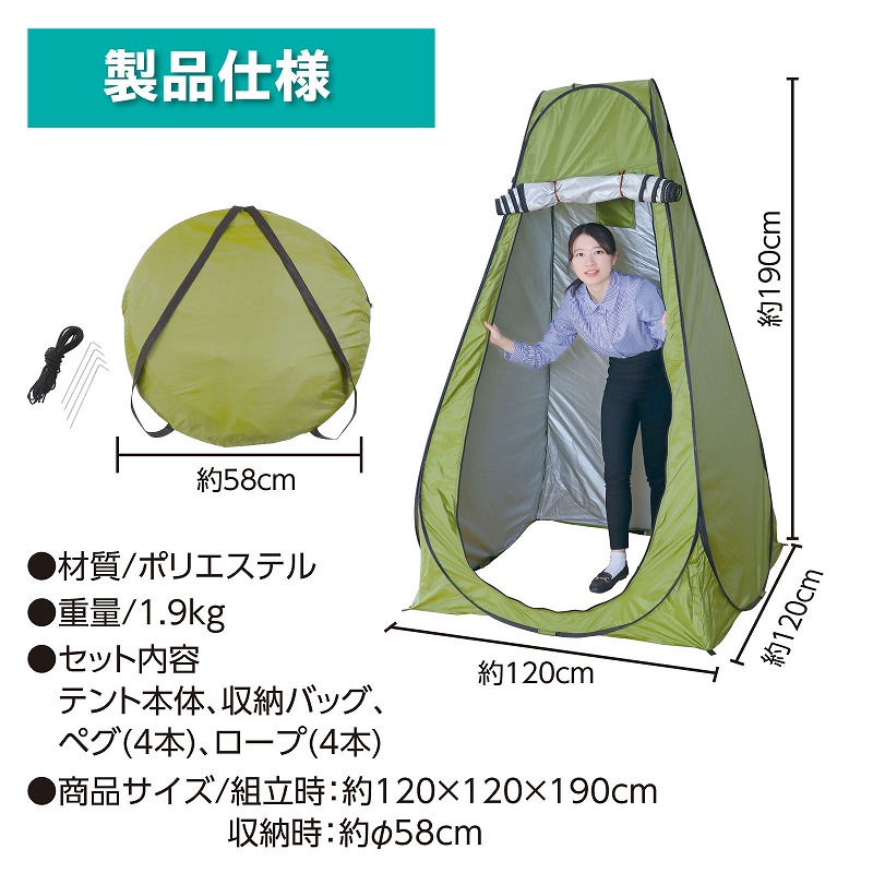 テント本体、収納バッグ、ペグ(4本)、ロープ(4本)