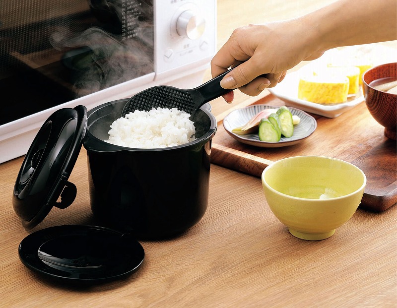本体/耐熱ポリプロピレン(備長炭粉末配合)(耐熱温度:140度、耐冷温度:-20度)、飯ベラ/ポリプロピレン(備長炭粉末配合)(耐熱温度:120度、耐冷温度:-20度)、計量カップ/ポリプロピレン(耐熱温度:120度、耐冷温度:-20度)