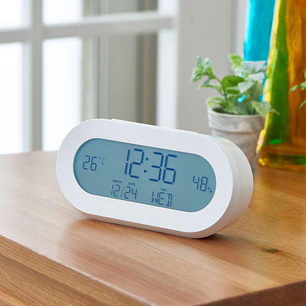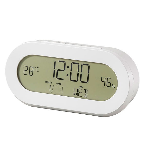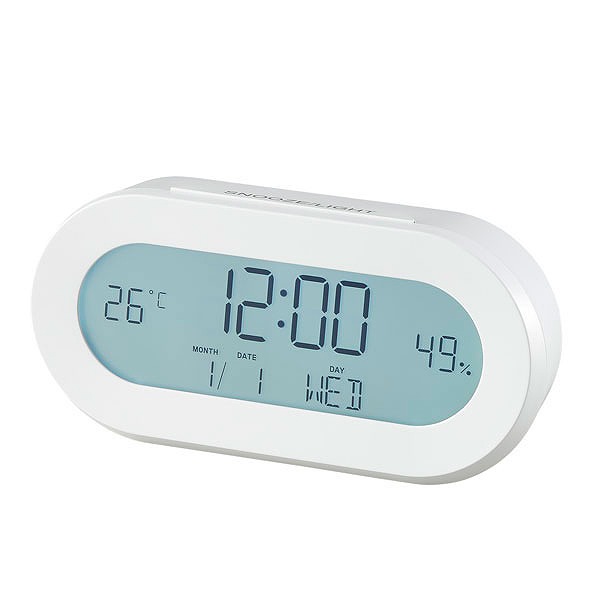 時計、アラーム、スヌーズ、カレンダー、温度計、湿度計、バックライト