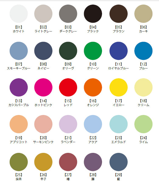 選択 ・ ホワイト ・ ライトグレー ・ ダークグレー ・ ブラック ・ ブラウン ・ カーキ ・ スモーキーブルー ・ ネイビー ・ オリーヴ ・ グリーン ・ ロイヤルブルー ・ カシスパープル ・ ホットピンク ・ レッド ・ オレンジ ・ イエロー ・ クリーム ・ アプリコット ・ サーモンピンク ・ ラベンダー ・ アクア ・ エメラルド ・ ライム ・ 抹茶 ・ 辛子 ・ 椿 ・ 藤 ・ 藍