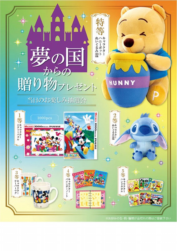 特等:キャラクターハニーポットぬいぐるみ33×1コ/1等:キャラクタージグソーパズル1000pcs×2コ/2等:キャラクターぬいぐるみ20×3コ/3等:キャラクターテーパーマグ×4コ/4等:キャラクターバインダーノート×5コ/5等:キャラクターハンドタオル×35コ/A3ポスター/抽選箱/くじ50枚/店頭用お知らせPOP2枚