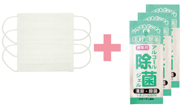 不織布サージカルマスクと、携帯にも便利な、1回分の除菌ジェルをパウチした分包タイプのアルコールジェル各3個ずつのセットです。