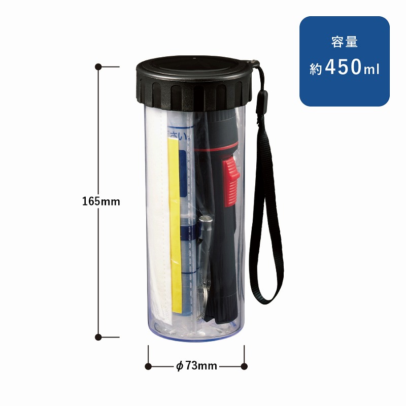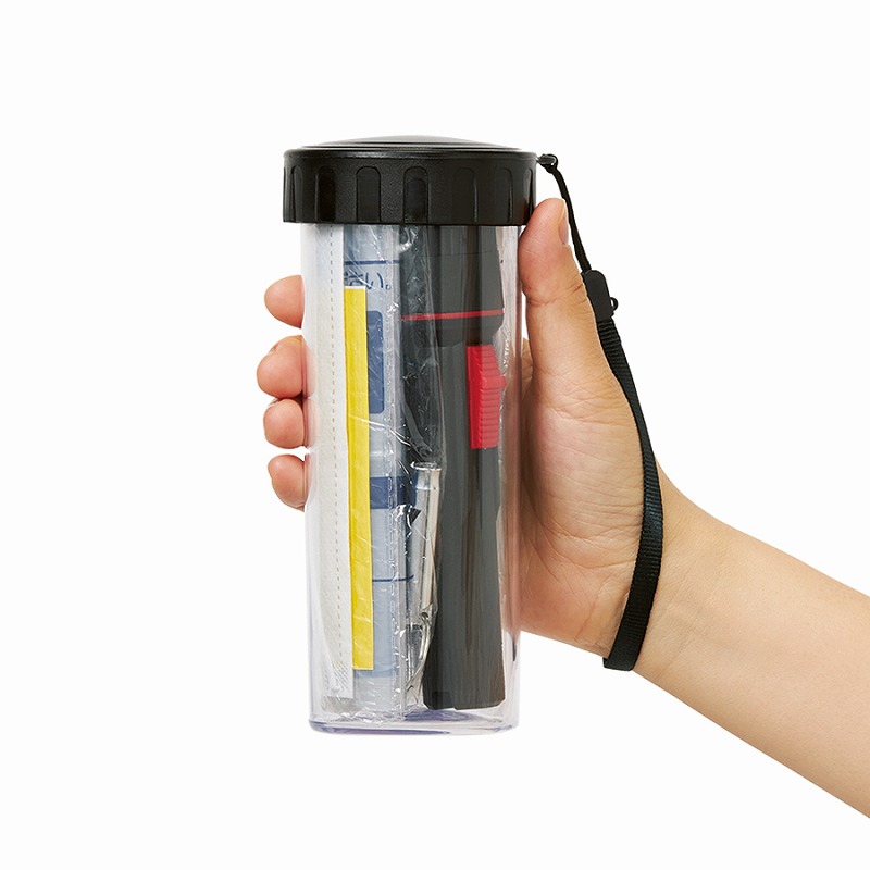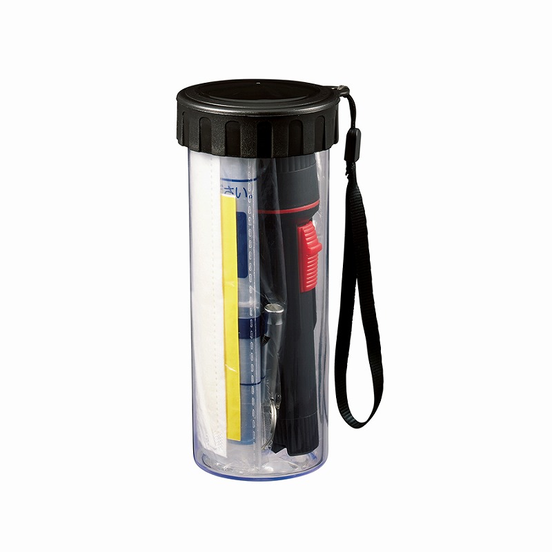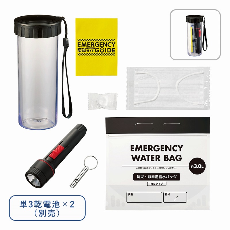 ボトル/Φ73×165(mm) ウォーターバッグ/約300×270(mm) LED防災ライト/Φ35×145(mm) ホイッスル/29×46×9(mm) 圧縮タオル/広げた時:約200×220(mm) マスク/約165×95(mm) 防災ガイド/70×105(mm)