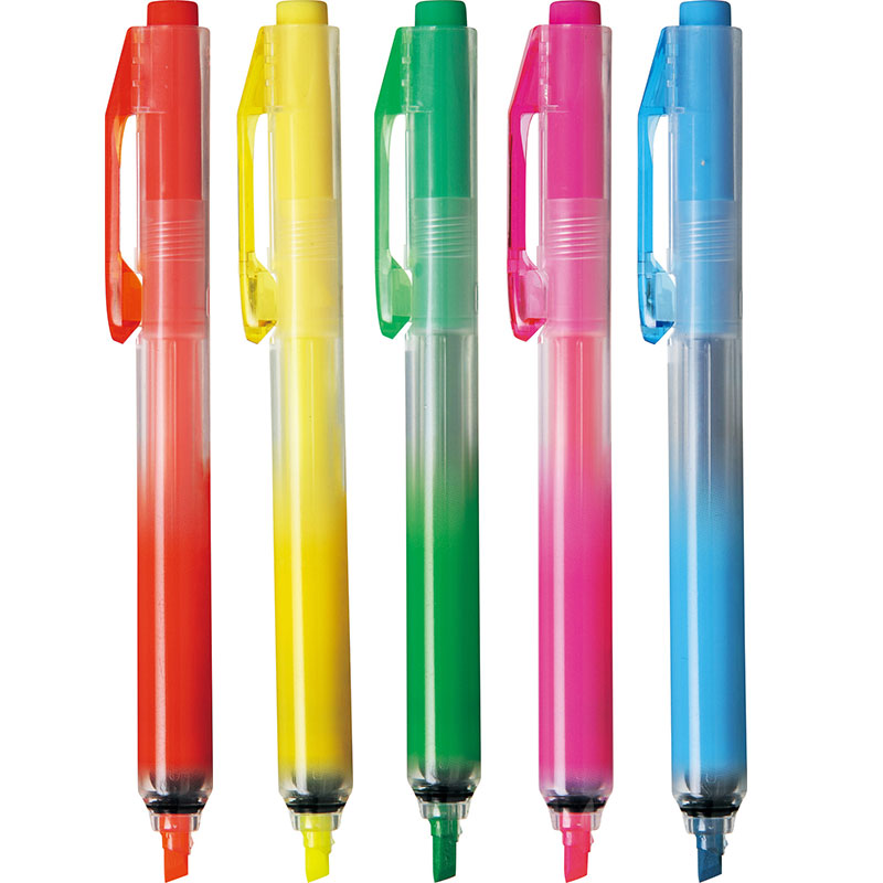 ペン先の出し入れは押だけ。ノック式蛍光マーカー。ノック式だからキャップを無くすことはありません。片手ですぐ使う事ができます。普通紙・OA用紙に使えます。