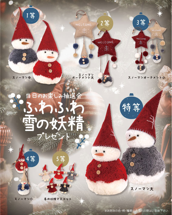 特等 スノーマン・大・・・2本 1等 スノーマン・中・・・4本 2等 スノーマンオーナメント・大・・・6本 3等 スノーマンオーナメント・小・・・8本 4等 スノーマン・小・・・10本 5等 冬の妖精マスコット・・・70本 【付属品】 ■抽選用くじ(100人用100枚) ■抽選箱 1個 ■くじ明細書 1枚
