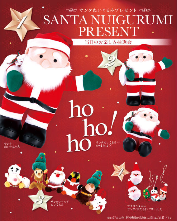 1等 サンタぬいぐるみ大・・・1本 2等 サンタぬいぐるみ 中(座または立) ・・・4本 3等 サンタワールドぬいぐるみ・・・15本 4等 サンタ・雪だるま・ツリー凡天・・・80本 【付属品】 ■抽選用くじ(100人用100枚) ■抽選箱 1個 ■くじ明細書 1枚