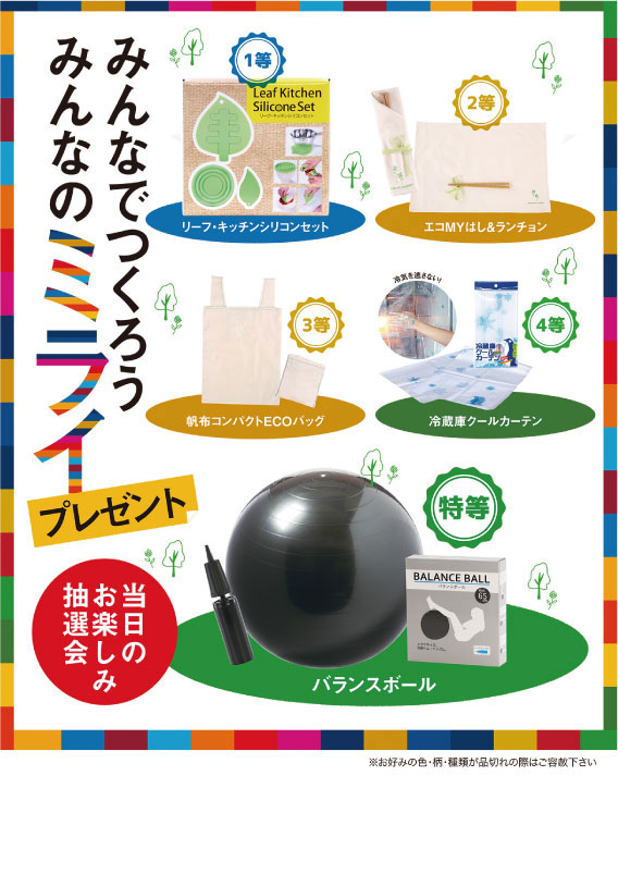 特等:バランスボール×1コ/1等:リーフ・キッチンシリコンセット×2コ/2等:エコMYはし&ランチョン×3コ/3等:帆布コンパクトECOバッグ×4コ/4等:冷蔵庫クールカーテン×90コ/A3ポスター/抽選箱/くじ100枚/店頭用お知らせPOP2枚