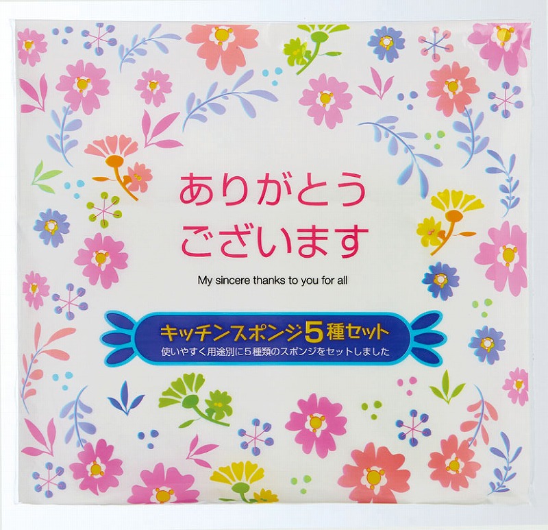 感謝の気持ちをプリントしたパッケージに、使いやすく用途別に5種類のスポンジをセットしました。