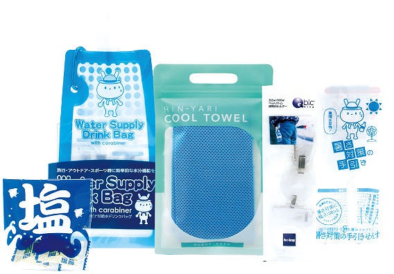 暑さ対策の手引きせんす・カラビナ付給水ドリンクバッグ・塩飴セット・ペットボトル携帯用ホルダー・ひんやりクールタオル×各1