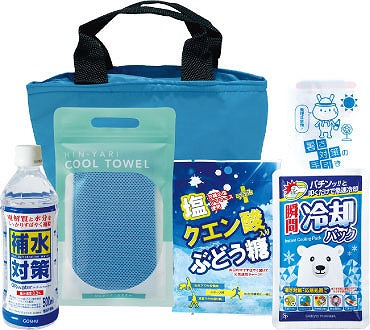 暑さ対策の手引きせんす・ミラクルアイスNEO・補水対策ORウォーターH・塩クエン酸入りぶどう糖・ひんやりクールタオル・ソロア 保冷温お出かけバッグ×各1