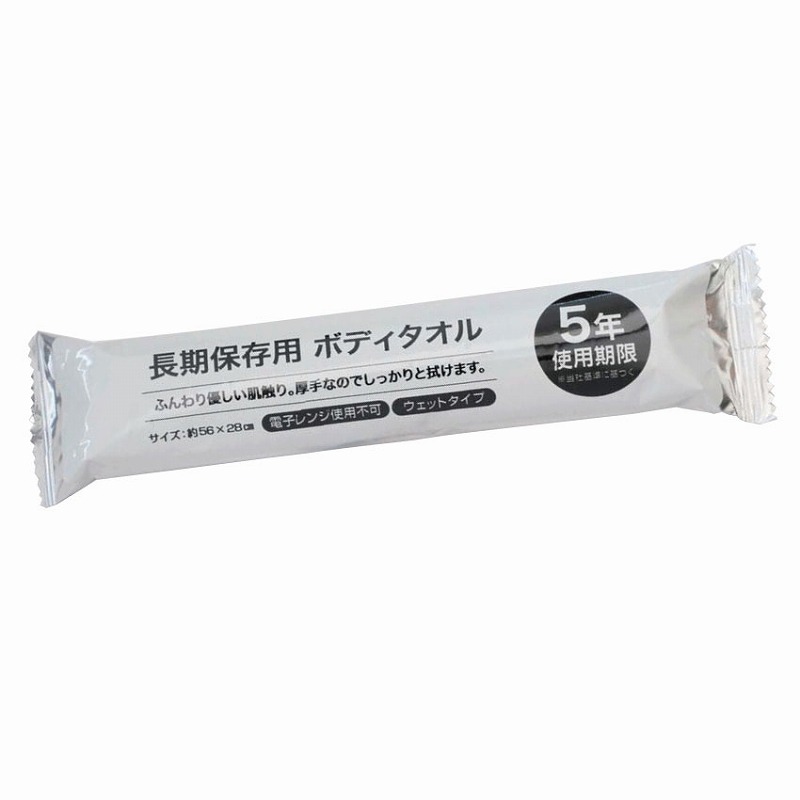 アルミフィルム使用で長期保存(使用期限5年)が可能な、超大判、厚手不織布の使い捨てのウェットタオルです。