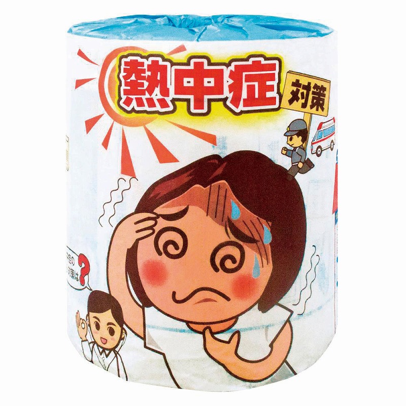 熱中症にならないための適切な予防と応急処置がとれるような内容が包装紙とトイレットペーパーにプリントしています。夏をもっと楽しむための、熱中症の対策も日ごろから心がけておきましょう。夏の各種のイベントで販促用にも啓蒙用にもご利用いただけるトイレットペーパーです。