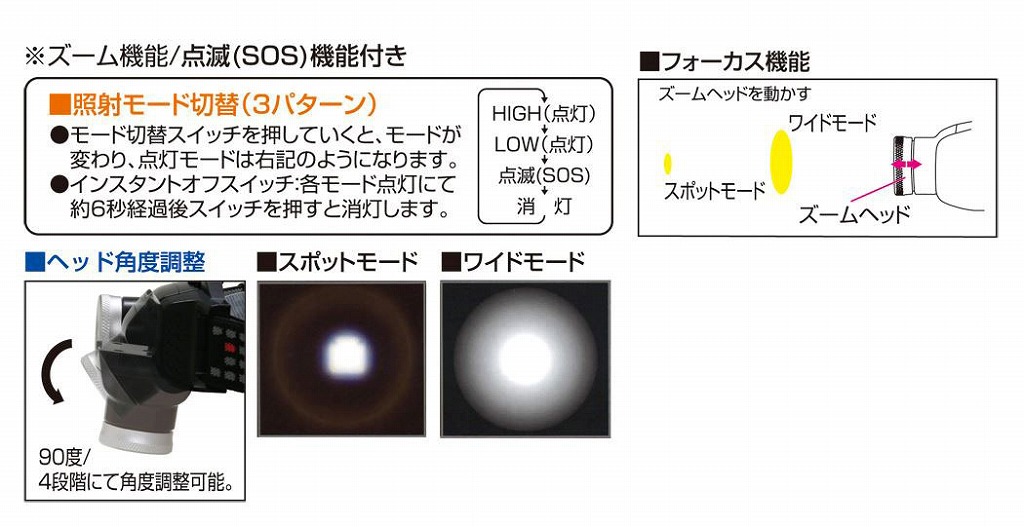 調整機能、フォーカス(ズーム)機能、点灯パターン: 3 パターン