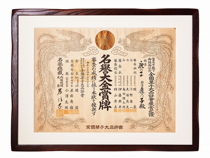 東京銀座四丁目交差点すぐ近くに位置する「銀座鹿乃子」。1階は店舗、2階は喫茶。 1959年、現在の上皇陛下が皇太子時代にご結婚されたのを記念して開催された全国菓子品評会。名誉大金賞牌を受牌(花かのこ)。