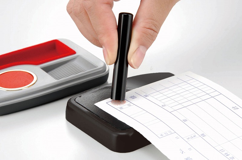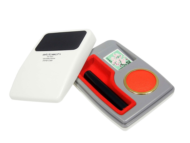 本体・フタ・パーツ:PS樹脂、中敷き:布、捺印マット:レザー、朱肉キャップ:真鍮