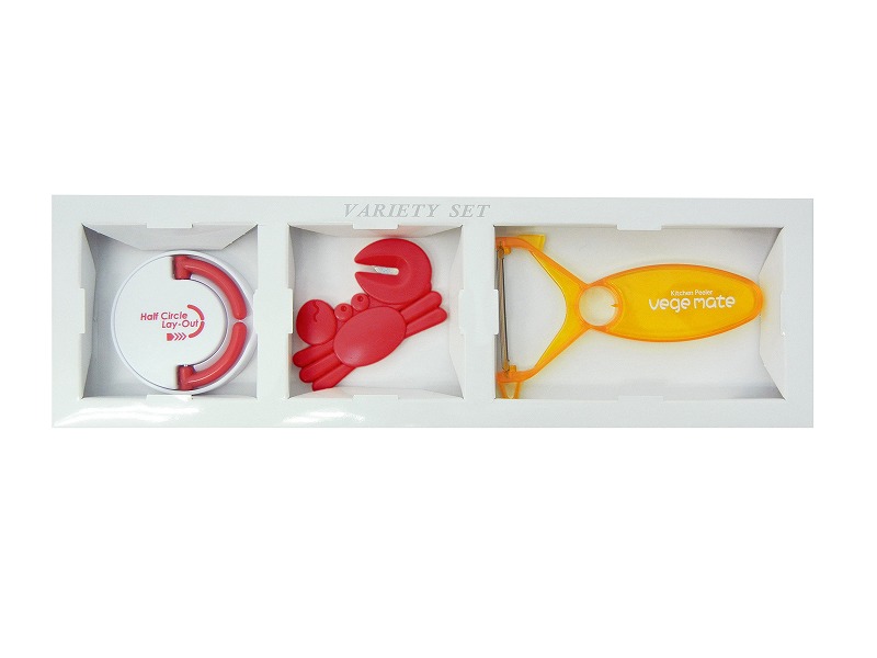 【ハーフサークル・レイアウト】本体:PS樹脂、フック・パーツ:PP樹脂、マグネット:マグネットシート、【かに丸・カッターマグネット】本体:PS樹脂、カッター刃:ステンレス、マグネット:マグネットシート【ベジメイト】本体:AS樹脂、ピーラー刃:ステンレス