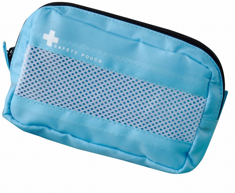 (ポーチ)150×100×40mm(21.8g)、(ハサミ)49×104×6mm(14g)、(綿棒)70×104×5mm(6.6g)10本入、(衛生ガーゼ)30×100cm(12.5g)10本入、(サージカルテープ)1.2cm×9mm(4.5g)10本入、(絆創膏)50×90mm5枚×2セット(計10枚)