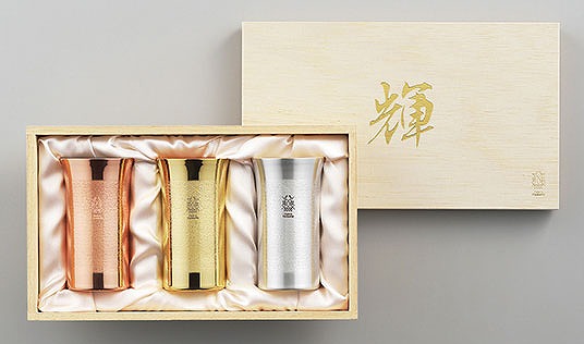 表面には水滴がつき、より一層涼やかさを演出してくれます。金仕上げは耐食性に優れ金属臭がしない金メッキを内外面に、銀仕上げは殺菌効果・耐食性に優れた銀メッキを内外面に、純銅タンブラーは内面にイオン効果のある錫メッキを、それぞれが輝きを放ち、特別な時間をより一層引き立たせます。持ち手には手触りの良い質感をまとった槌目模様。伝統の技術を集約し、デザイン性・機能性を兼ね備えた高品質のひとくちタンブラーセット。こちらの商品は、Made in TSUBAME認定商品です。