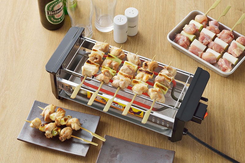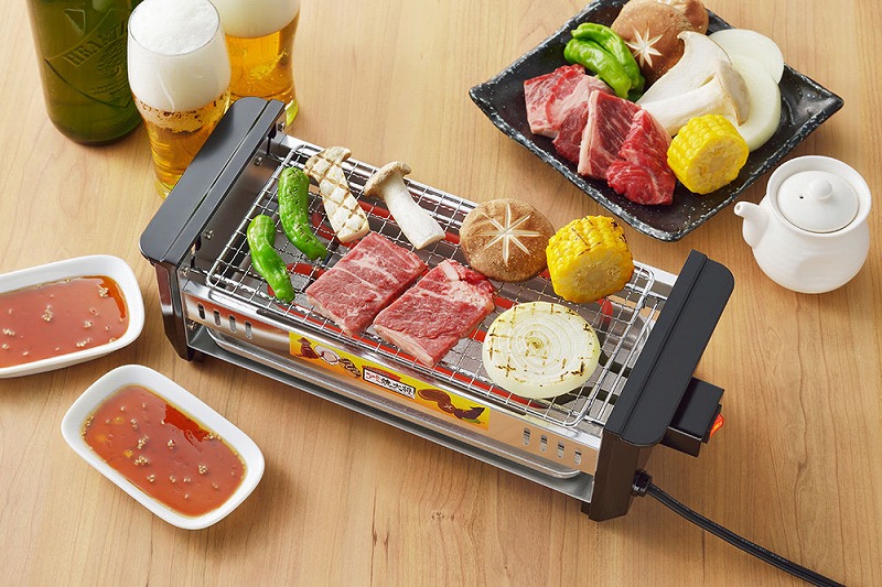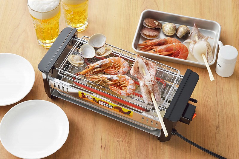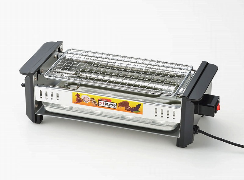 本体:フェノール樹脂・鉄、網:鉄(クロムメッキ)、油受けトレイ:鉄、たこ焼きプレート:アルミニウム合金(フッ素樹脂塗膜加工)、コードの長さ:約1.5m、AC100V/1000W、50/60Hz、付属品:油受けトレイ・焼き網・たこ焼きプレート