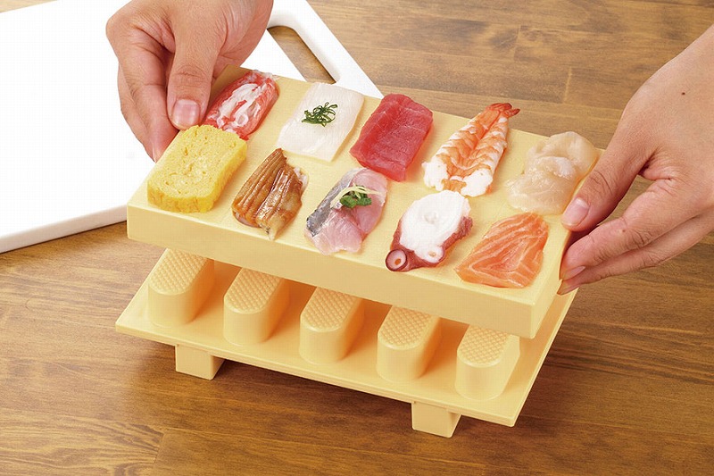 本体:ポリプロピレン(耐熱温度120℃)、寿司型パーツ(天板):ポリプロピレン(耐熱温度120℃・耐冷温度?20℃)