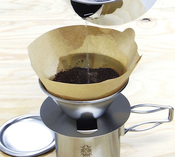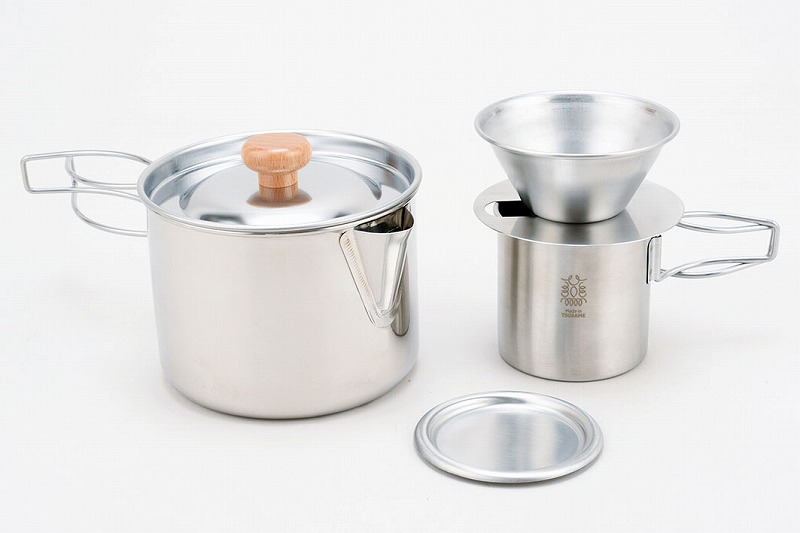 二重マグカップ:約φ74×72mm(129g・200?)、マグカップ蓋兼用受け皿:約φ79×3mm(19.5g)、ドリッパー:約φ90×50mm(30g)、ドリッパー受台:約φ95×0.8mm(15g)、ケトルクッカー:約140×123×110mm(237g・1070?)