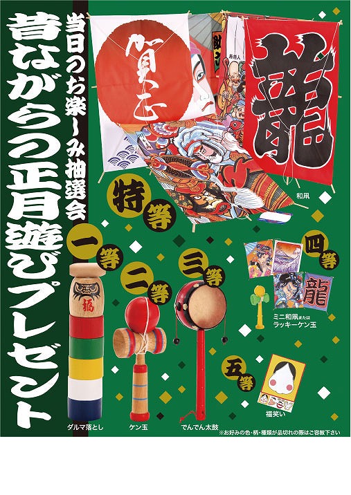 特等 和凧・・・2本 1等 ダルマ落とし・・・3本 2等 ケン玉・・・4本 3等 でんでん太鼓・・・5本 4等 ミニ和凧またはラッキーケン玉・・・10本 5等 ミニ犬棒カルタまたは昔ばなしかるた、福笑い・・・76本 【付属品】 ■抽選用くじ(100人用100枚) ■抽選箱 1個 ■くじ明細書 1枚
