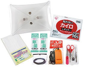 4方向から開くポーチに女性のための防災アイテムがセットされています