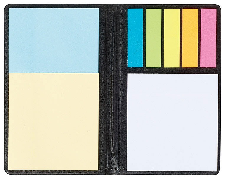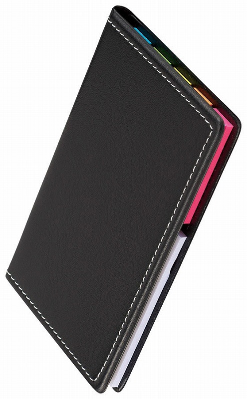 ステッチ入りのレザー調で高級感のあるカバーを開くと4サイズ8色の付箋が綴じられており、用途や目的に合わせて使い分けられる便利な付箋セットです。 ■フセン枚数各30枚