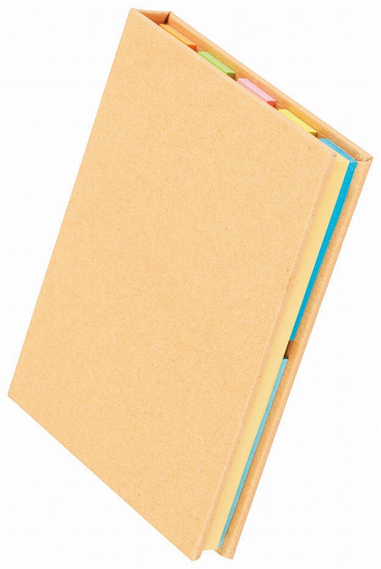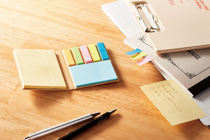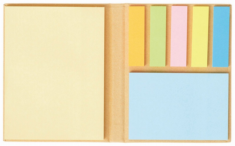 カバーに再生紙を利用した環境にやさしい付箋セット。 7色3サイズの付箋メモが閉じてあり、項目ごとに分けて使用できます。 ■付箋枚数:大50枚、中25枚、小各25枚