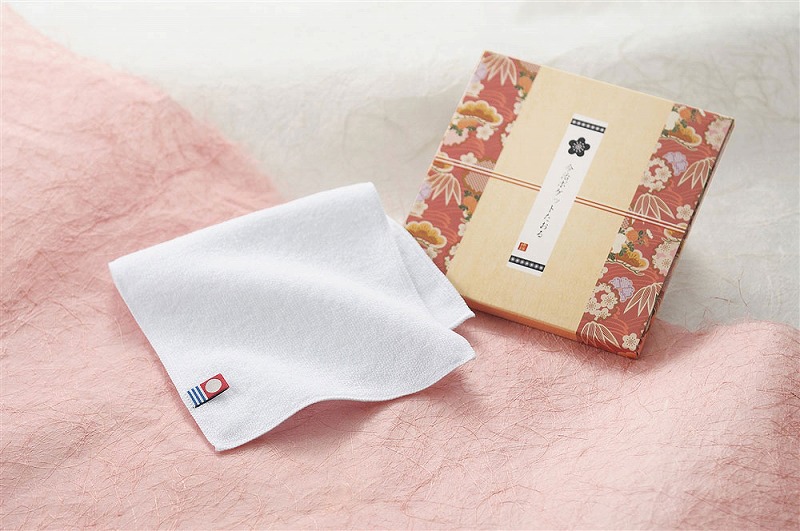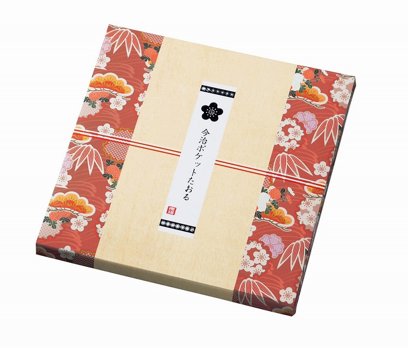 裏面パイル仕上げの綿100%の今治タオルです。この形は半分に折ってパンツやジャケットのポケットに入れてもかさばりません。通常のハンカチタオルよりも小さくなりますが、今治タオルの高い給水力がしっかりと水分を吸収します。あでやかなデザインのタトウ式化粧箱入り。