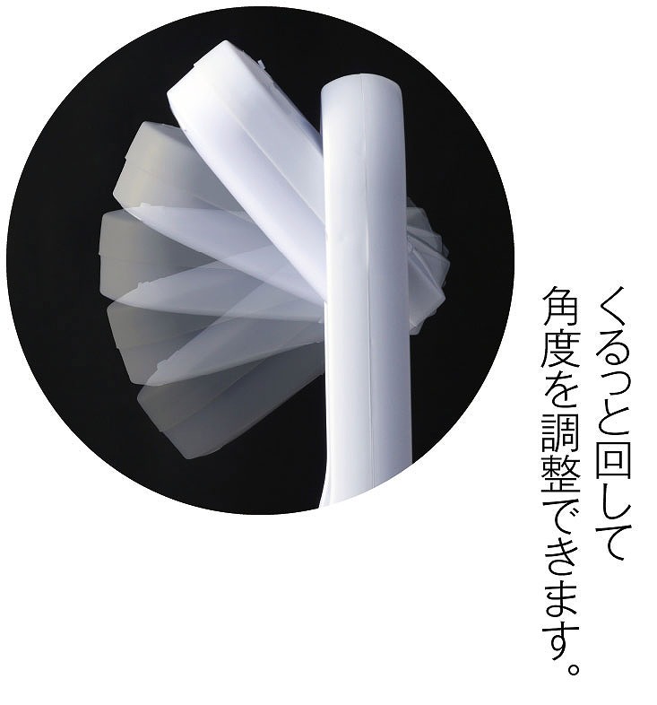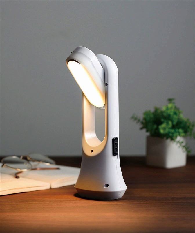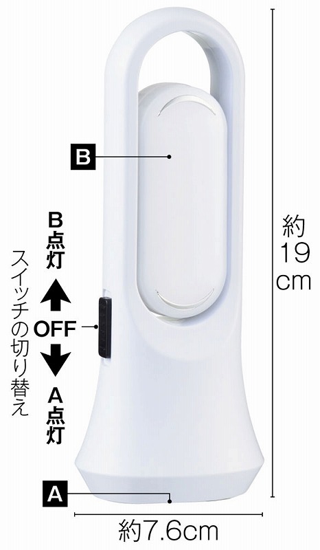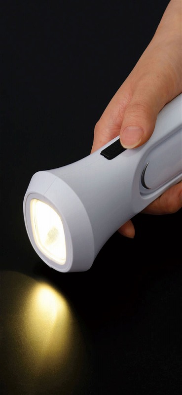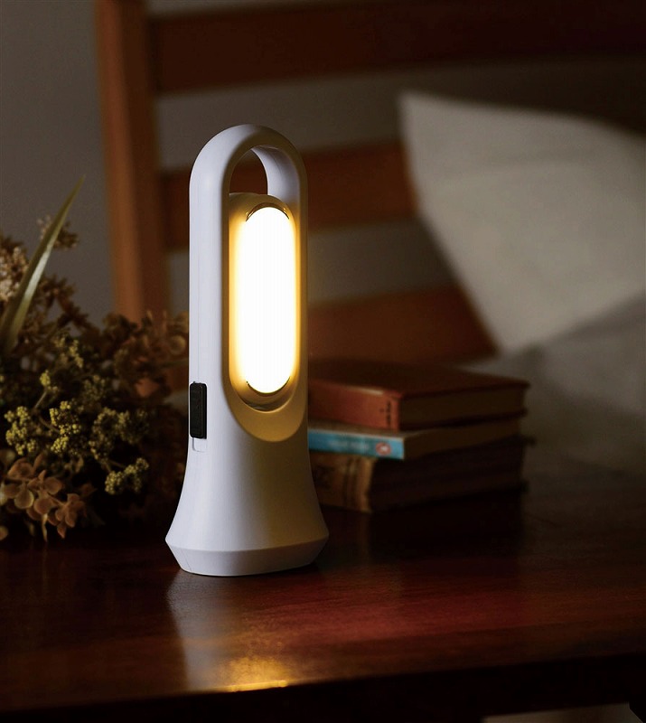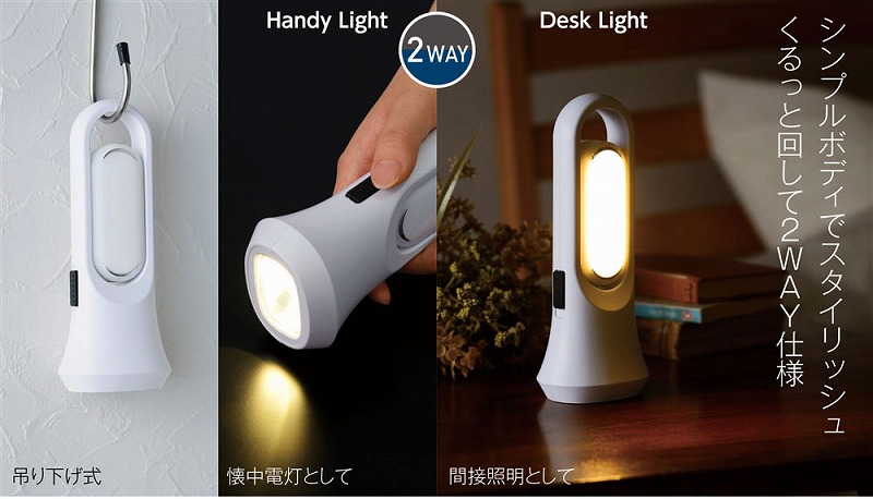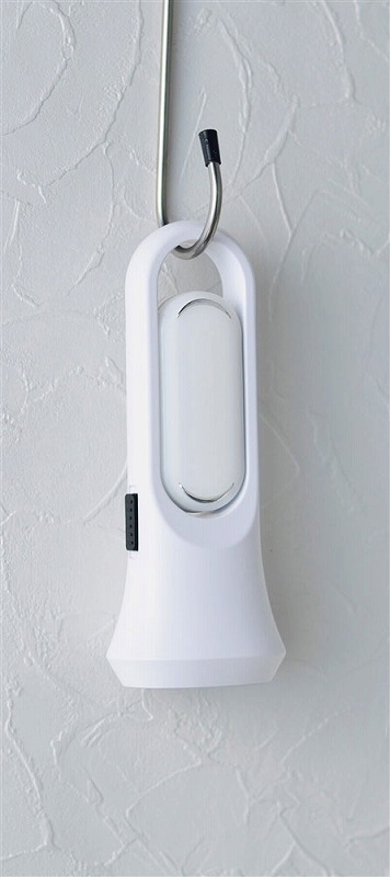 手持ちなら懐中電灯として、置き型ならデスクライト・間接照明として。ハンドル部分をフックに掛ければ吊り下げ式ライトとしても使えます。ライト部分は角度調整も可能。LED使用。