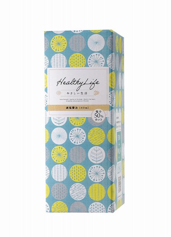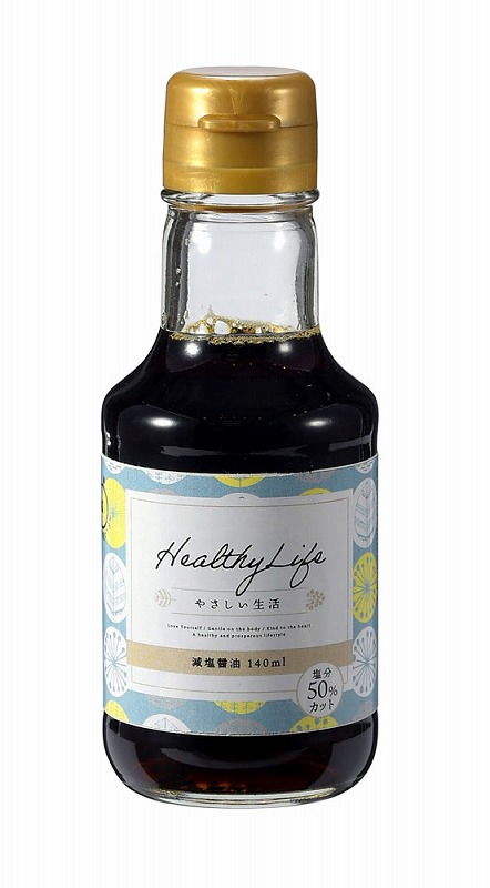 おいしさそのまま、一般的なしょうゆの半分以下の塩分です。健康増進を目指すスポーツ庁のプロジェクト「FUN+WALK PROJECT」の紹介QRコードが付いています。