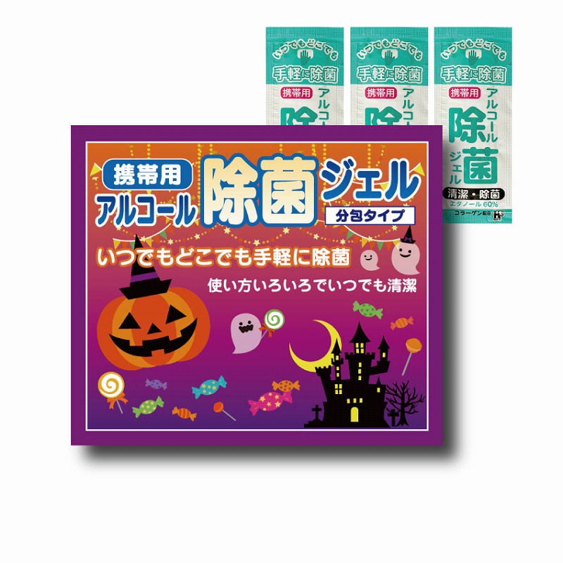携帯にも便利な、1回分の除菌ジェルをパウチした分包タイプのアルコールジェル3包入。ハロウィンパッケージ