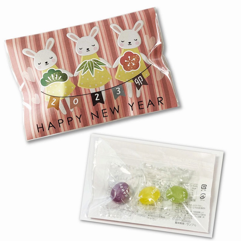 干支柄パッケージのプチギフ用キャンディ3粒入りです。フルーツキャンディはイチゴ、グレープフルーツ、ピーチ、グレープ、オレンジ、アップルの6つのフレイバーより、アソートで3粒入っています。日本から、香料、色素、個包装紙などの原料をタイへ送り、タイの工場にて製造し、再び日本へ送られて日本で検品、袋詰めをしております。