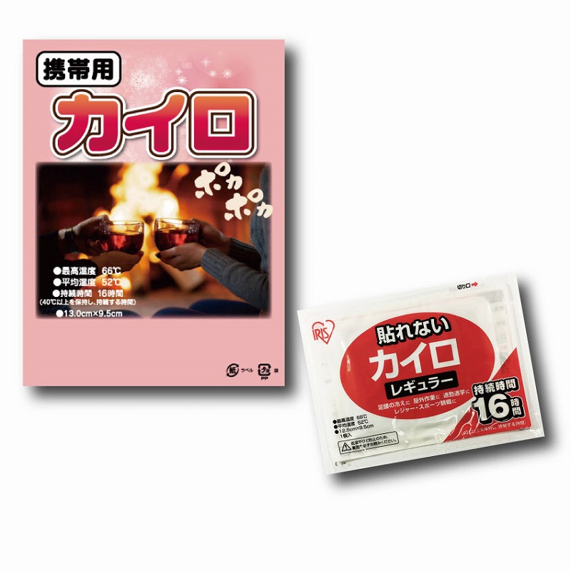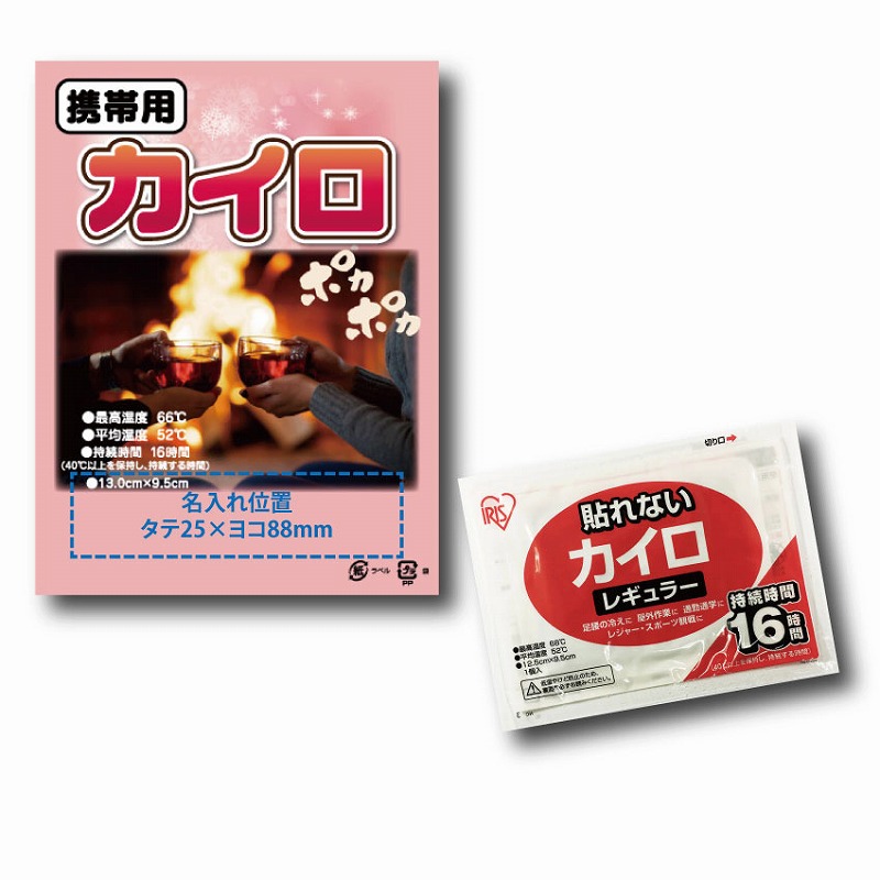 台紙付のPP袋入りの使い捨てカイロレギュラーサイズです。安心のアイリス製(日本製)。