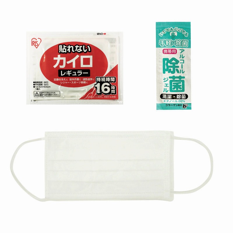 不織布サージカルマスクと使い捨てカイロレギュラーサイズとアルコール除菌ジェルのセットです。カイロは安心のアイリス製(日本製)。