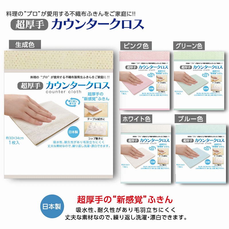 超厚手の”新感覚”ふきんです。吸水性、耐久性があり毛羽立ちにくく丈夫な素材なので、繰り返し洗濯・漂白できます。