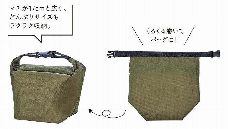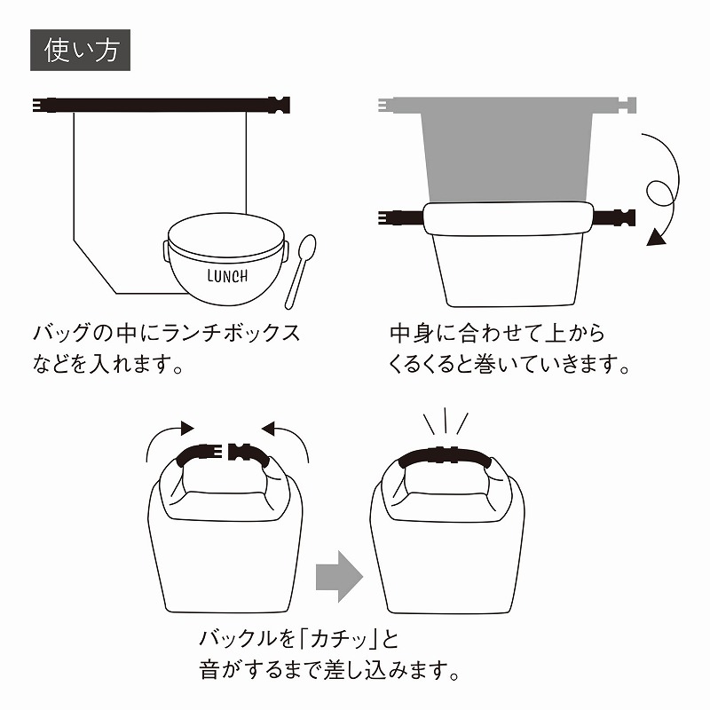 1袋の上端をくるくると折り返して、左右の差し込みバックルをリング状に留めると、持ち手付きの保冷温ランチバッグに!