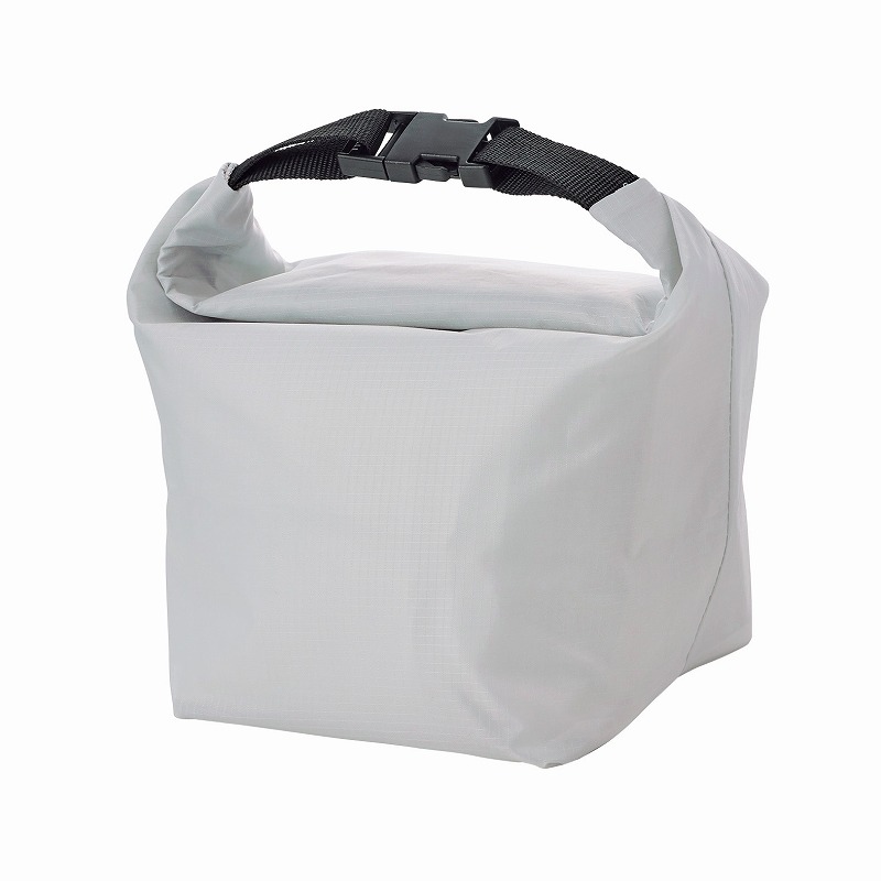 1袋の上端をくるくると折り返して、左右の差し込みバックルをリング状に留めると、持ち手付きの保冷温ランチバッグに!