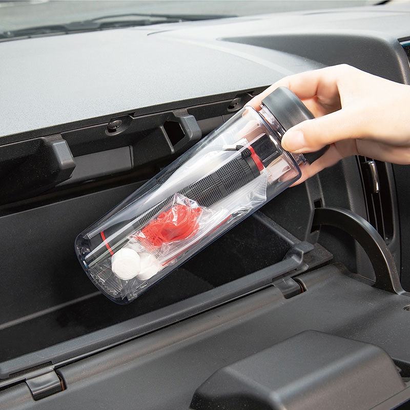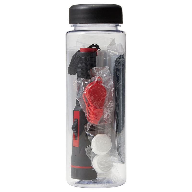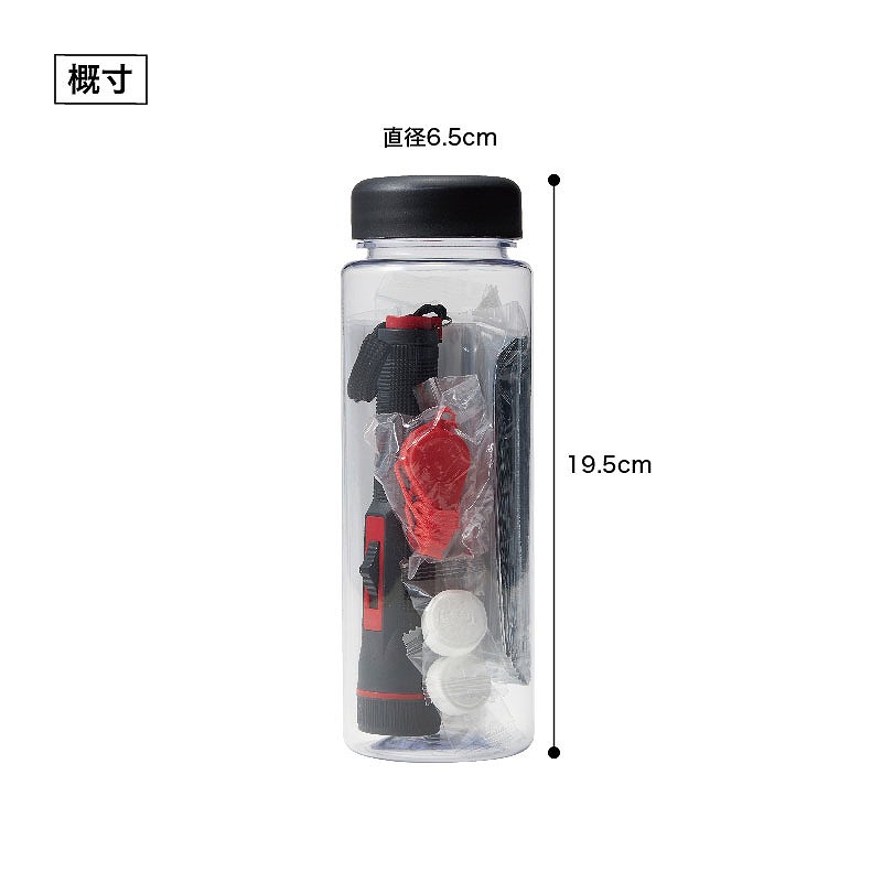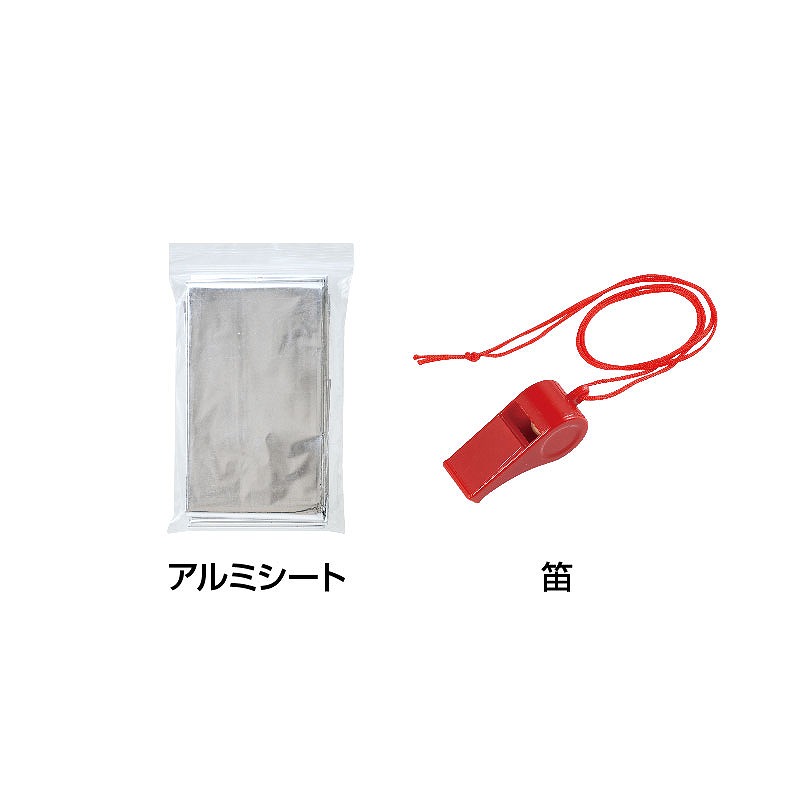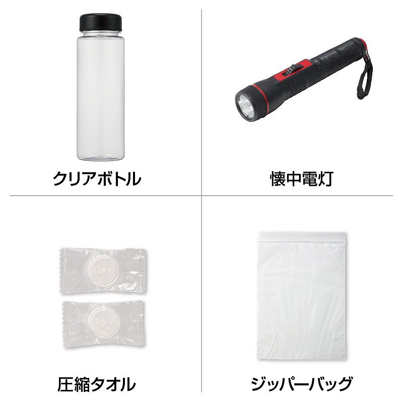 クリアボトル×1・LEDライト×1・アルミシート×1・圧縮不織布タオル×2・笛×1・ジッパーバッグ×2