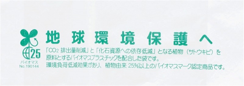 環境負荷を低減する植物由来25%以上のバイオマスマーク認定商品です。 SDGsの観点として、原材料で「CO2排出量削減」と「化石資源への依存低減」となる植物(サトウキビ)を原料とするバイオマスプラスチックを配合しています。