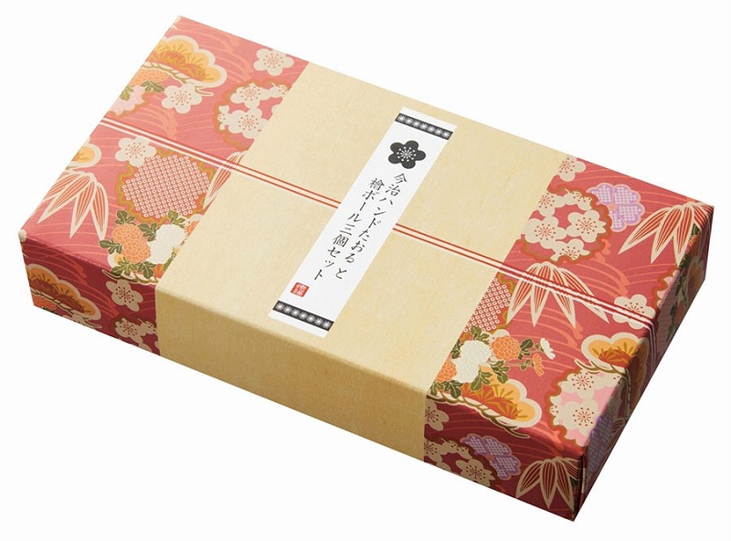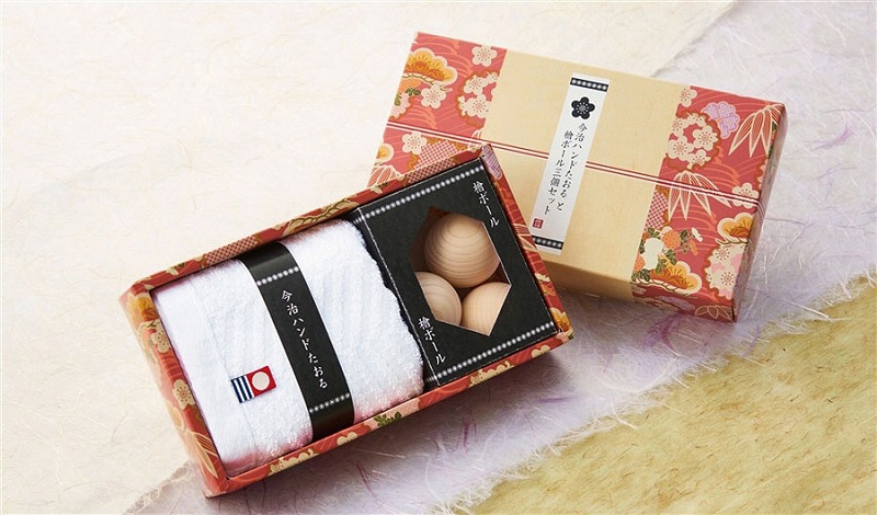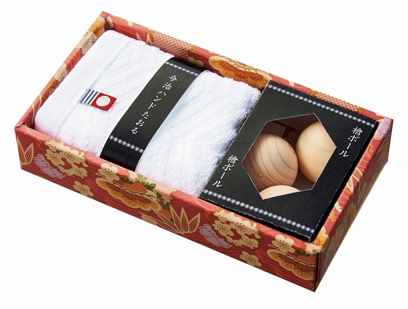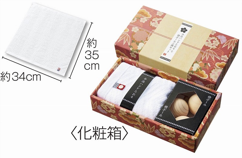上質な今治ハンドタオルと天然檜ボールのセット。和をイメージした箱入りギフトです。