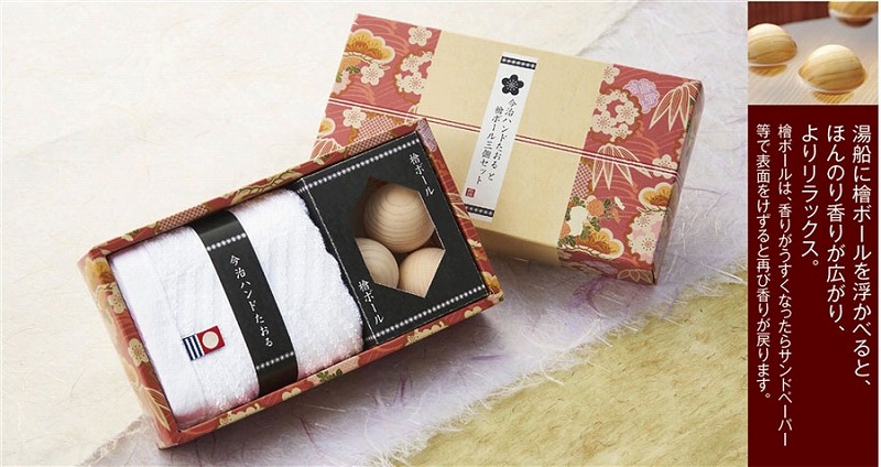 上質な今治ブランドのハンドタオルと、直径3.5cmの国産天然檜ボール3個をセットした心癒されるギフトです。檜ボールは、湯船に浮かべて香りを楽しんだり、下駄箱や洋服ダンスなどに入れてお使いください。また、ツボ押しボールとしてもお使いになれます。